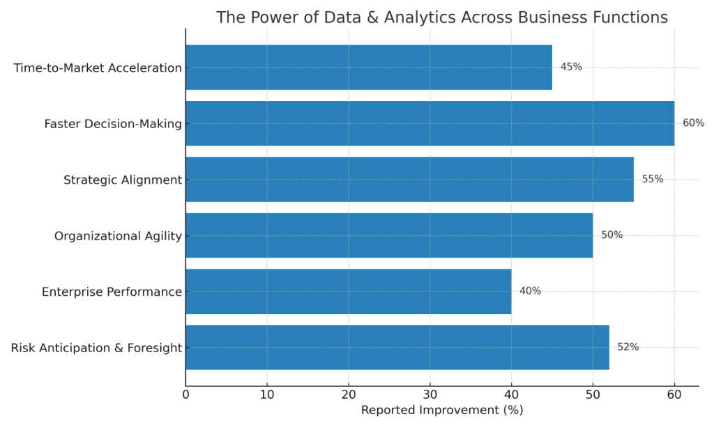 Data & Analytics close the gap between strategy and execution, helping solve complex problems and drive action. They accelerate time to market by delivering real-time insights, enabling faster decisions and first-mover advantage.