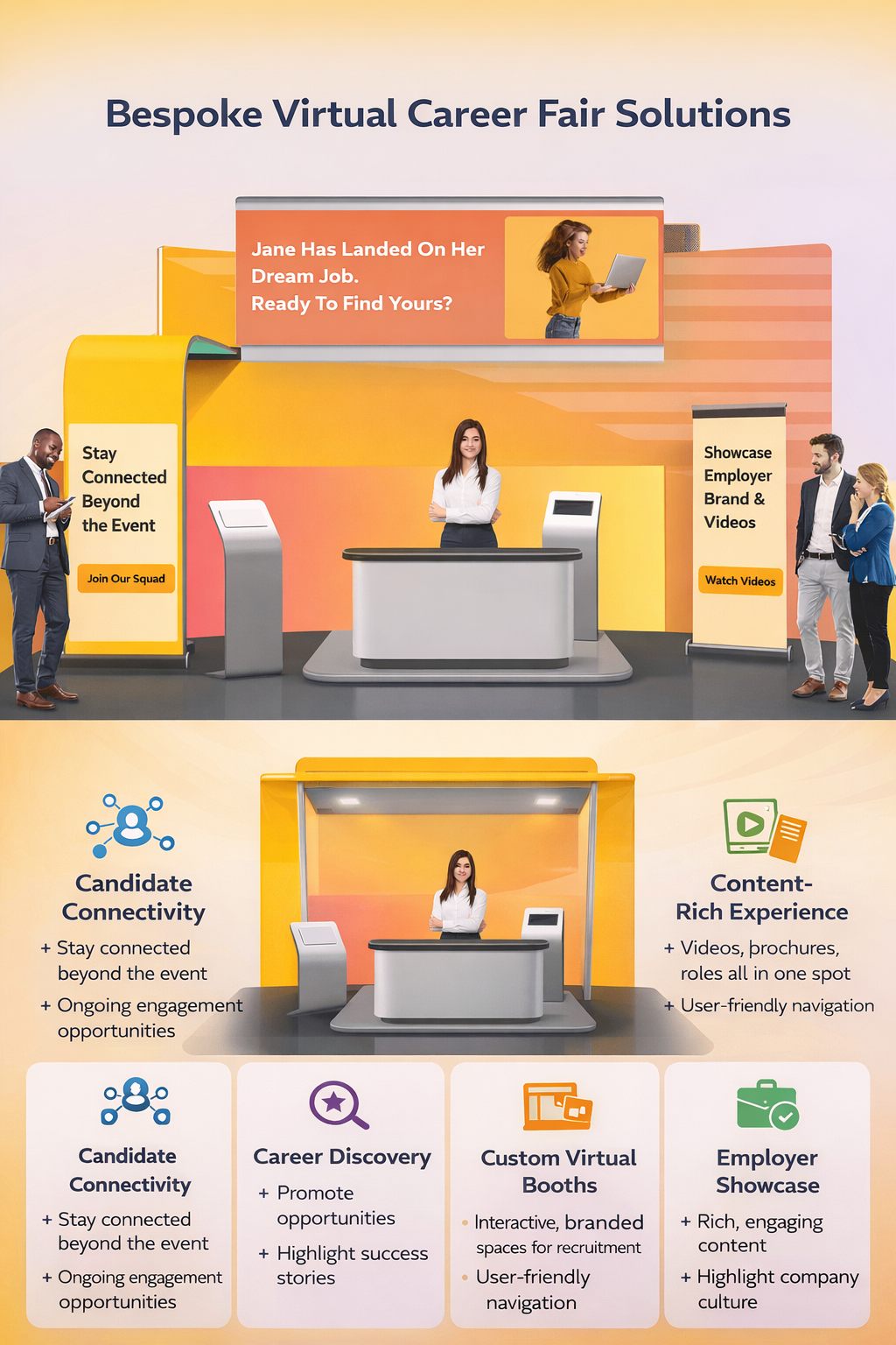 - Customisable virtual booths designed to reflect employer branding and corporate culture