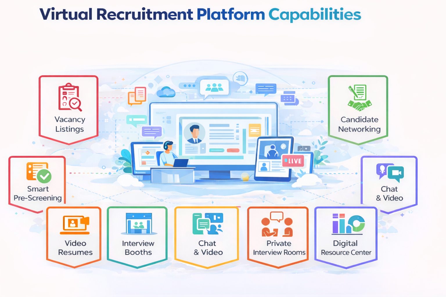 Virtual career and recruitment fairs create real-time opportunities for organisations to showcase their employer brand, connect with qualified candidates, and engage talent instantly through a digital platform. By moving recruitment online, organisations can reduce costs, expand reach, and accelerate hiring outcomes without the limitations of physical events.
