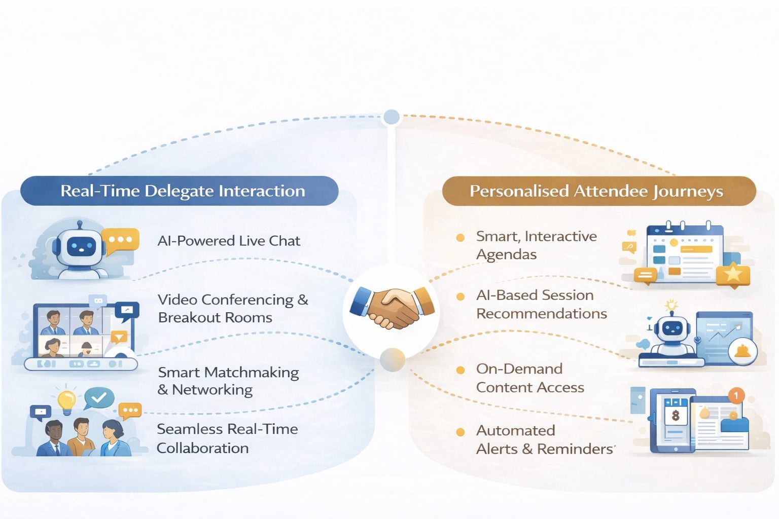 Virtual attendees can customise their event journey with interactive agendas, AI-based session recommendations, and on-demand content access. Automated alerts and mobile reminders ensure no important session is missed.