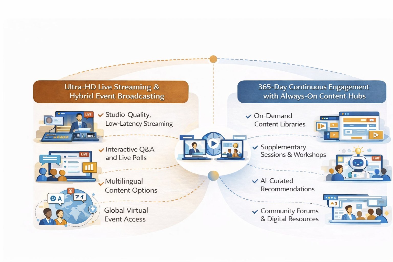 Keep your audience connected year-round with virtual content hubs, supplementary sessions, workshops, and digital resources. On-demand libraries, AI-curated recommendations, and community forums extend event value beyond the live experience.