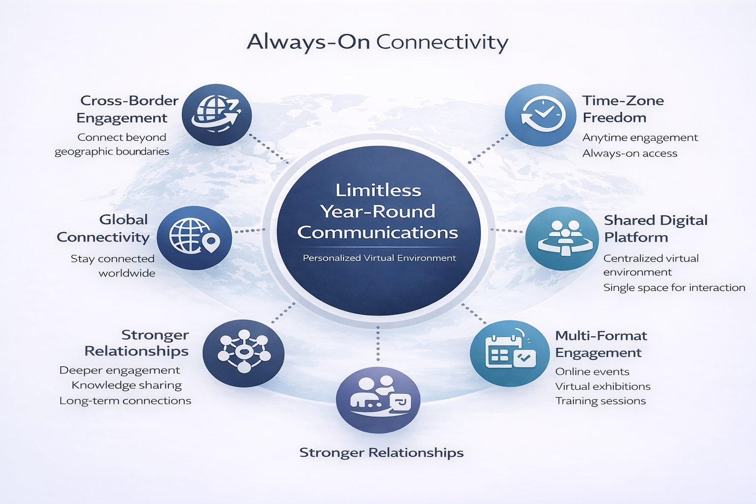 A personalised virtual environment enables organisations to leverage advanced digital tools to stay connected with customers, partners, and stakeholders—anywhere in the world. By removing geographical and time zone barriers, it provides a shared platform for audiences to interact through online events, exhibitions, or training sessions. This fosters stronger engagement, enhances knowledge sharing, and builds lasting connections between the organisation and its global audience.