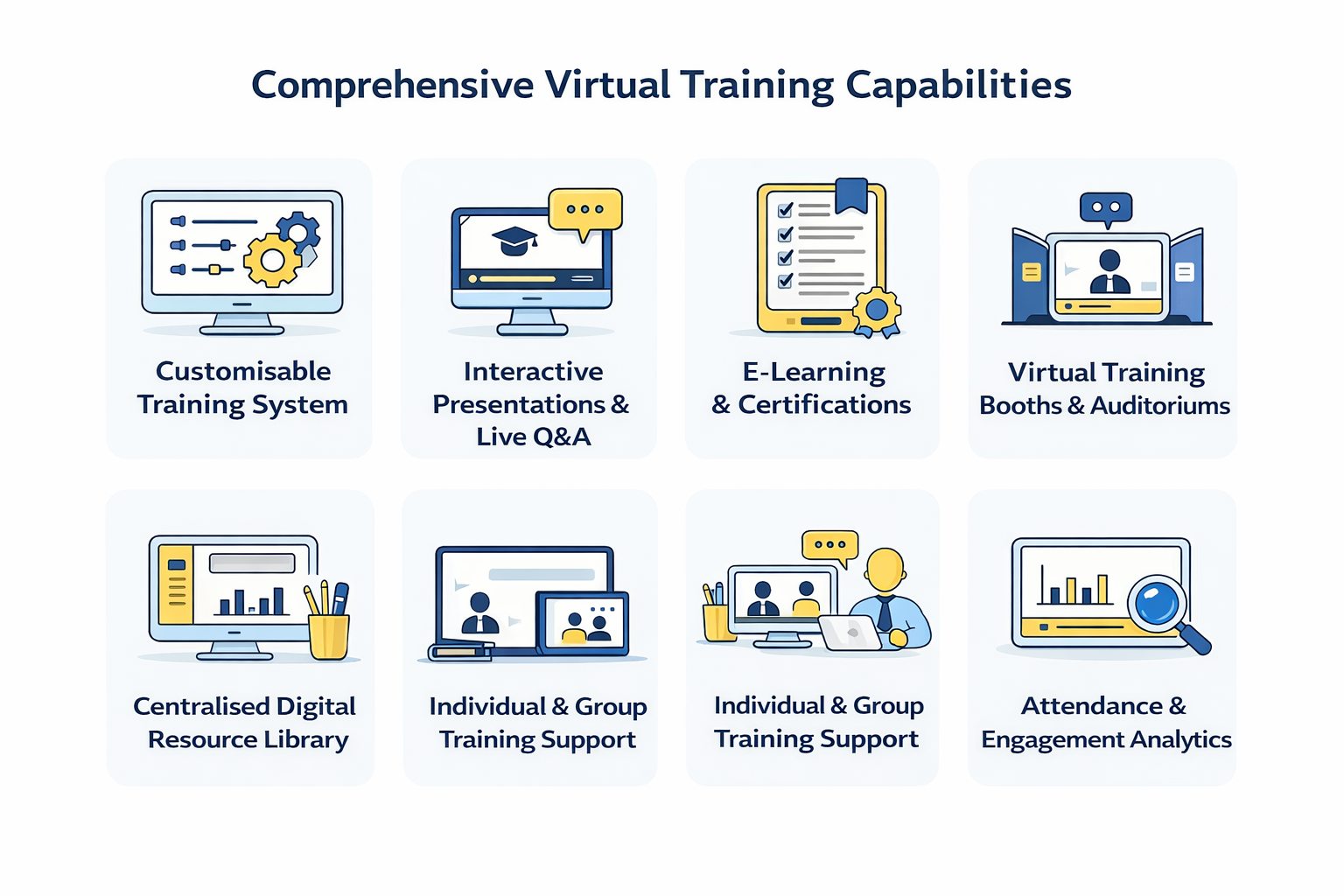 Our virtual training solution is designed to deliver flexible, scalable, and engaging learning experiences across organisations and locations. It supports structured knowledge delivery, real-time interaction, and measurable learning outcomes—enabling effective training, certification, and skills development in a fully digital environment.